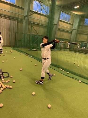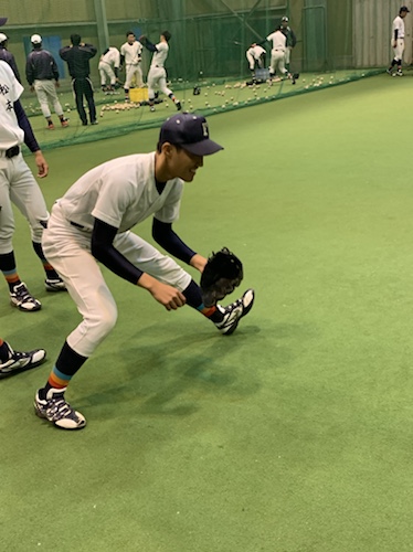 室内練習場では、野手がティーバッティングでの追い込み、バッティングの班回し、スイングの振り込みを行いました。投手は、ピッチング、トレーニング、ランニング、フィールディング練習を行いました。