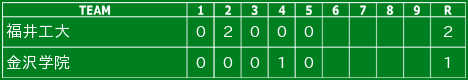 金沢学院大学戦:5回表 お知らせ 2019.05.19 ○福井工大の攻撃 ・⑧横山:ライト前ヒットにより出塁 0アウトランナー1塁 ・⑨神藤:送りバント成功 1アウトランナー2塁 ・①掛橋:セカンドへの進塁打 2アウトランナー3塁 ・②成澤:レフトフライに倒れる 3アウトチェンジ