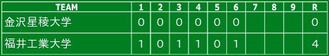 6回表 終了 お知らせ 2017.08.11 福井工業大学 選手交代 P新納→落合 金沢星稜大学の攻撃 ③橋場 センターフライ ・ ワンアウトランナーなし ④加藤 ライトフライ ・ ツーアウトランナーなし ⑤今村 フォアボール ・ ツーアウトランナー1塁 ⑥北川 ファーストゴロ ・ スリーアウトチェンジ この回の得点なし