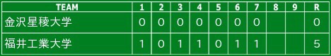 7回表 終了 お知らせ 2017.08.11 福井工業大学 選手交代 7八幡→堀場 5笹岡→服部 R小柳→8 金沢星稜大学の攻撃 ⑦坂本 空振り三振 ・ ワンアウトランナーなし ⑧山本 見逃し三振 ・ ツーアウトランナーなし ⑨H池上 見逃し三振 ・ スリーアウトチェンジ この回の得点なし